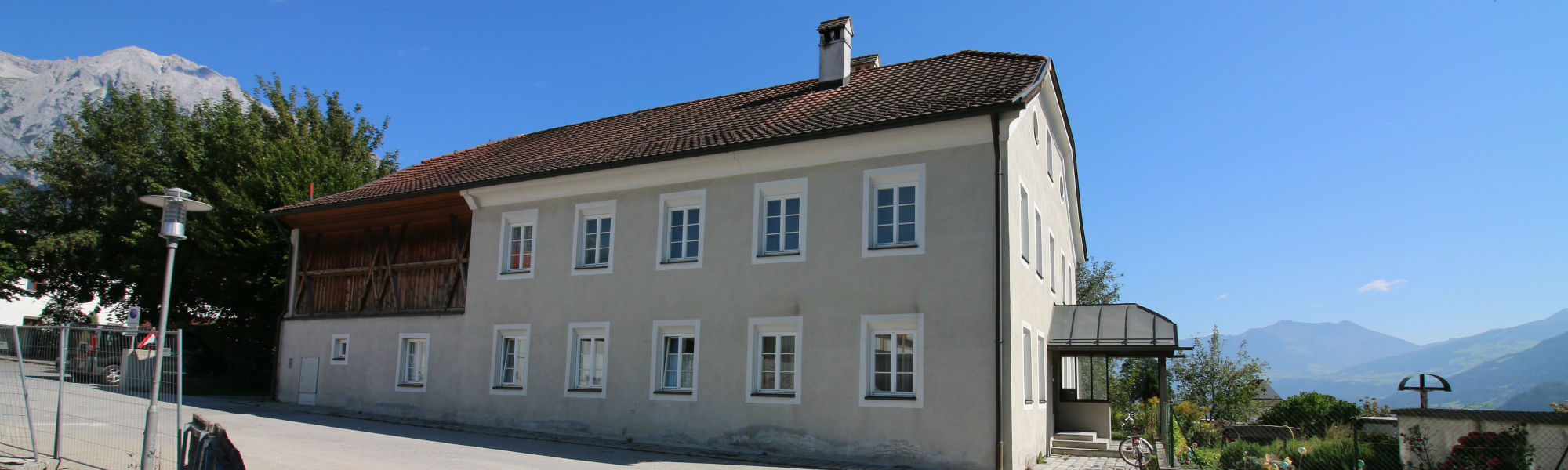 Links neben der Pfarrkirche in der Kurve befindet sich das Pfarramt Mils (Oberdorf 2).